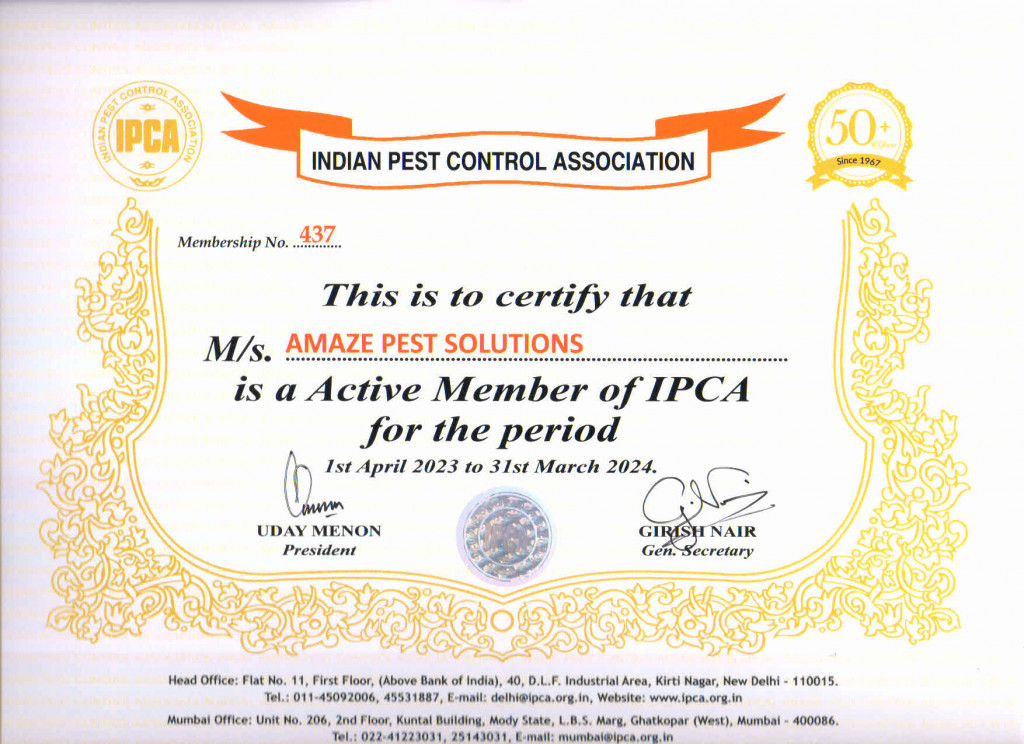 Apart from all the happy customers that Amaze Pest Solutions has gained over the years, one of the biggest success of the company is that Amaze Pest Solutions is an active member of IPCA (Indian pest control association).